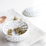 Marijuana Buds in a Porcelain Bowl on a Silver Placemat with Wooden Spoon and Lid – Minimalist Cannabis